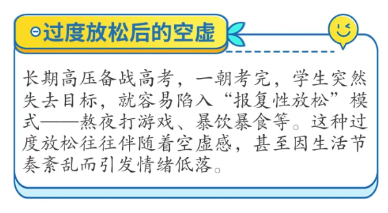 学生在高考后出现较为严重的焦虑或抑郁情绪,如果未能得到及时干预,可能会带来比较大的负面影响。一方面,短期内的情绪障碍干扰考后身心状态的整体调整,影响学生志愿填报时的理性决策;导致学生暑期生活作息紊乱、沉迷网络,不利于身心健康;另一方面,学生长期的焦虑或抑郁状态可能延续至大学阶段,表现为入学适应困难、学习动力不足等;进一步降低自我价值感,影响其未来面对挑战的信心。